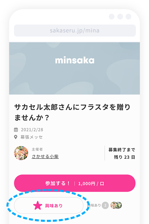 ミンサカでは、参加費の支払い完了=参加完了とさせていただいているため、参加費をお支払いいただかないと参加者としてカウントされない仕組みになっておりますが、「興味ありボタン」を設置し閲覧者さんに押していただくことで、「参加者としてカウントはされていないけれど企画に興味がある」という方々を把握できるようにいたしました。