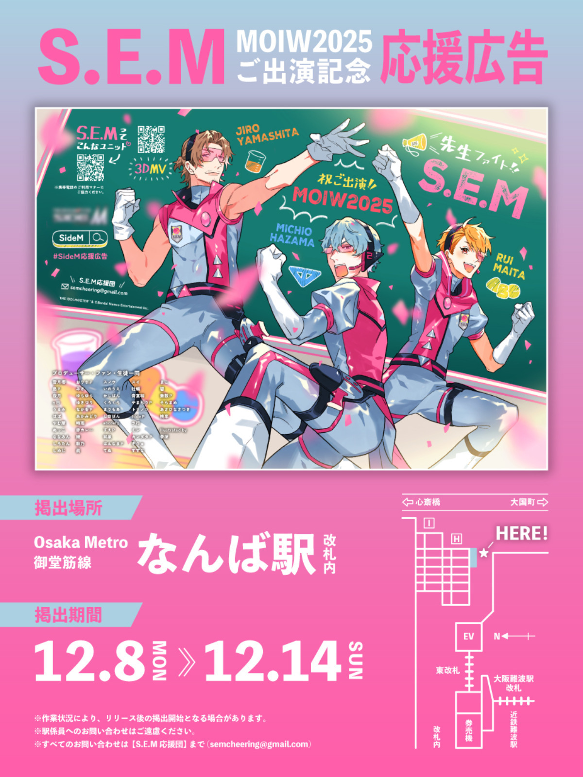 掲出開始日12月8日(月)正午頃、Xの企画アカウント( https://x.com/SEM_cheering )にて掲出場所等の詳細をご案内予定です!