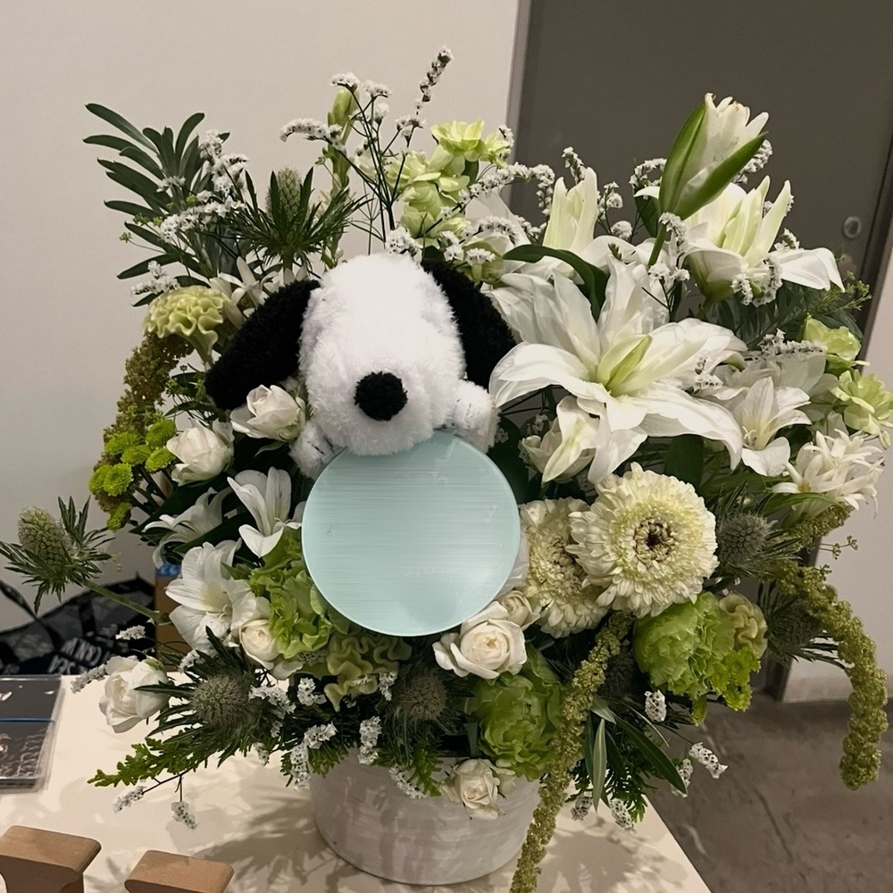 楽屋花ではありますが、会場入口あたりにお花を置いて頂けたので実物を見たのですが、大きすぎず、調度良いサイズでとても可愛らしかったです。ほとんどお任せでお願いしてしまいましたが、ご本人のイメージぴったりに作って頂き、満足の行くものになりました。