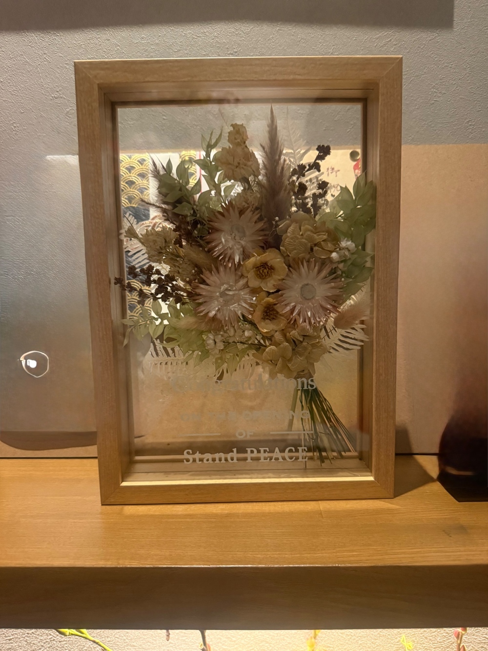 ドライフラワーとプリザーブドフラワーをガラスの中に閉じ込めました。お花の色味は、贈り先様のイメージカラー等ご希望に合わせてお作り可能です。ガラス面には文字入れもできるので、お祝いや記念のギフトにぴったり。届いたら置いて飾るだけなので、お手入れ不要。お忙しい方にも喜ばれるフラワーギフトです。