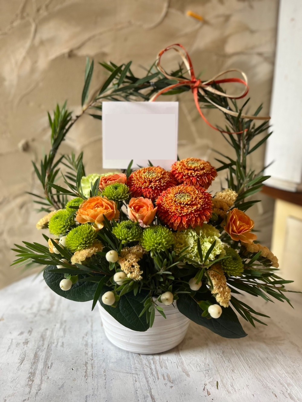 明るいオレンジをメインに、ナチュラルな優しさも感じられるアレンジメントです。これからのご活躍、商売繁盛、幸せな未来への架け橋になるように、そんな想いをアーチに込めてお作りいたします。