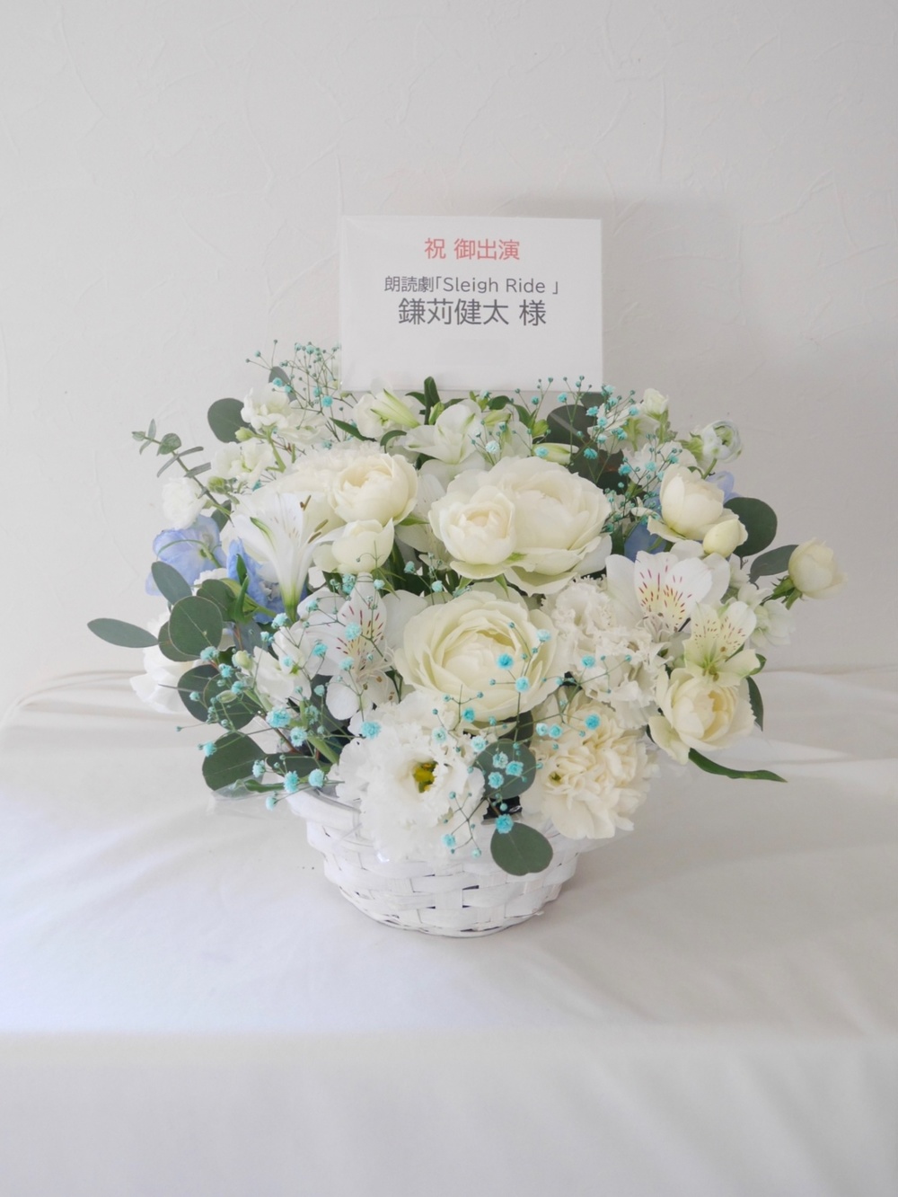 爽やかな白の取っ手付きのカゴにお花を敷き詰めたフラワーバスケットです。カゴいっぱいに摘んだお花入れたようなナチュラルなデザインに仕上げました。ライブや舞台公演の楽屋花としてもおすすめ。会場を明るく彩り、出演者の方への応援やお祝いの気持ちをやさしく届けてくれます。