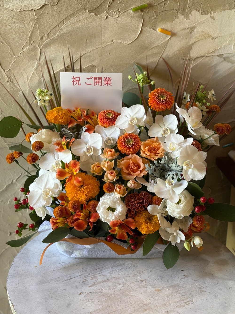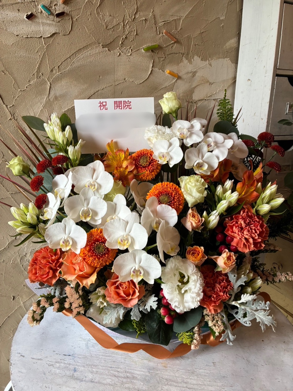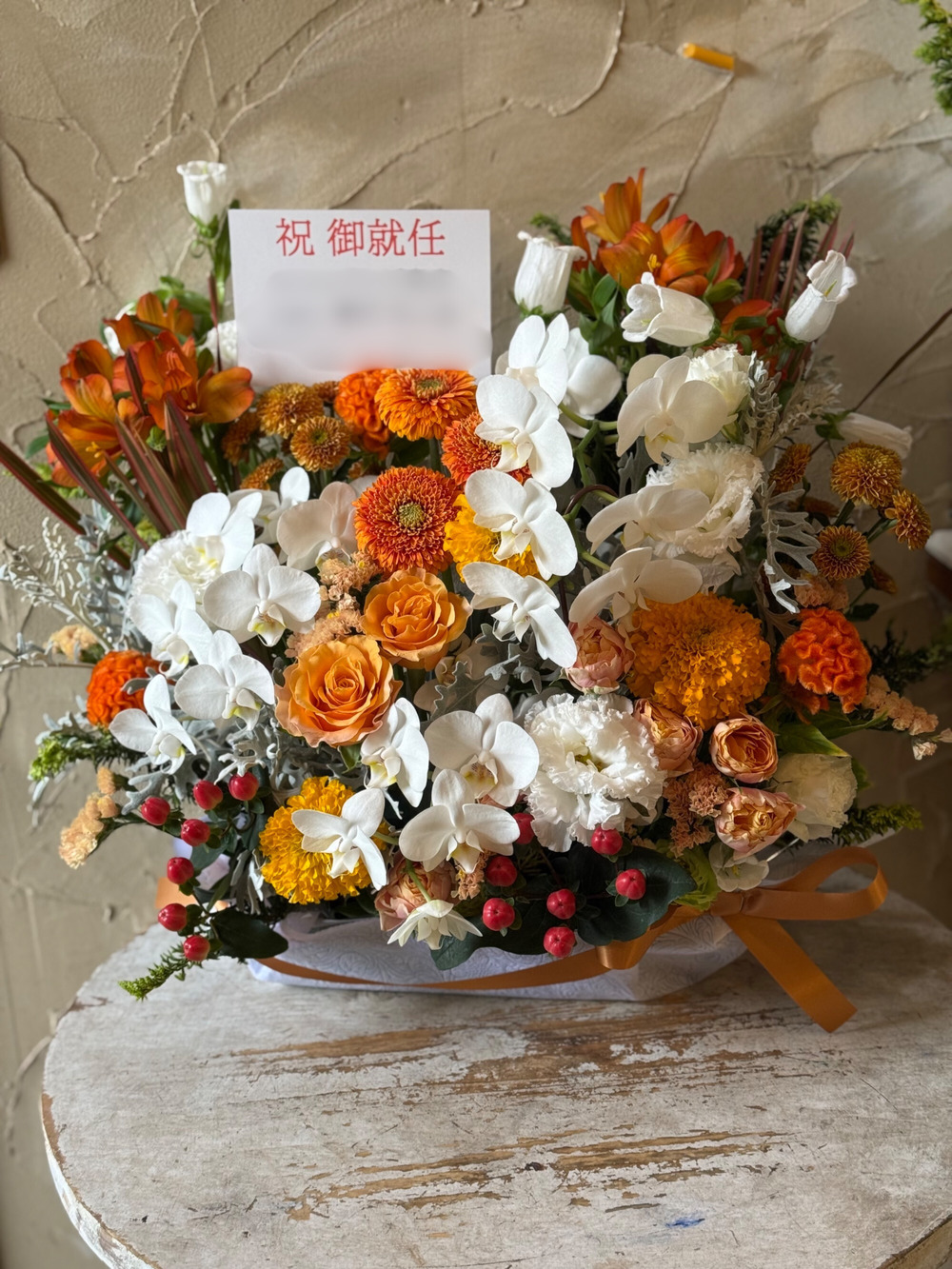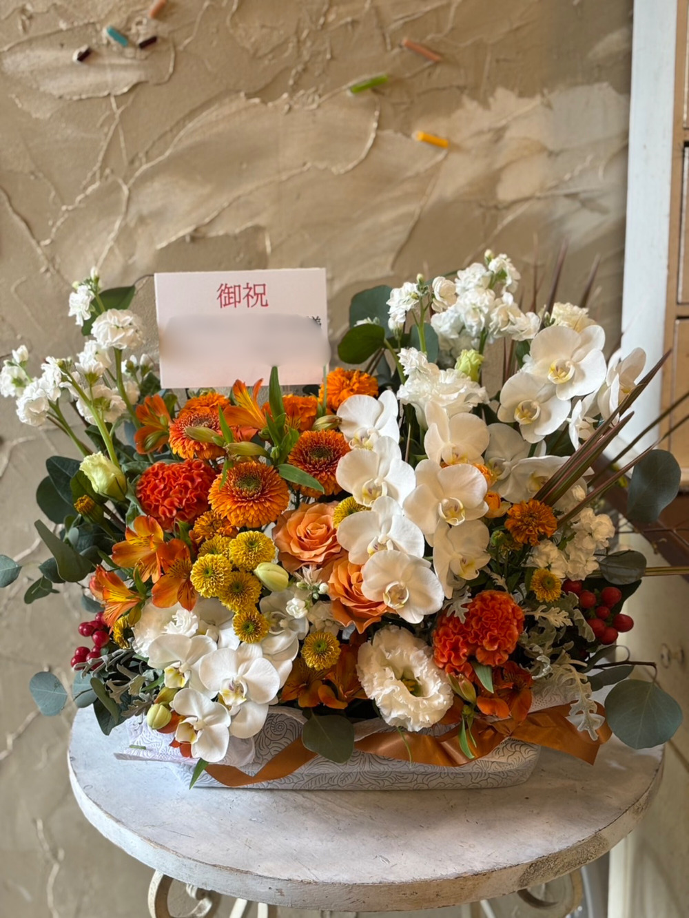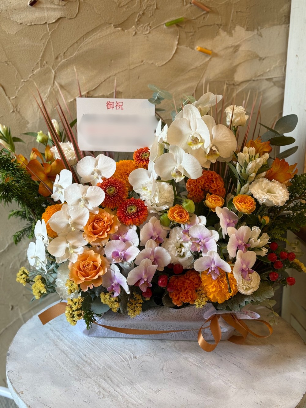 人気の胡蝶蘭を贅沢に3本お入れして、オレンジのガーベラやバラなどを合わせたアレンジ。お花に合わせて器をラッピングし、リボンをお付けしていますのでそのまま飾っていただける華やかなシリーズです。