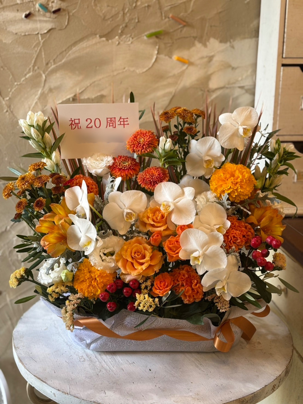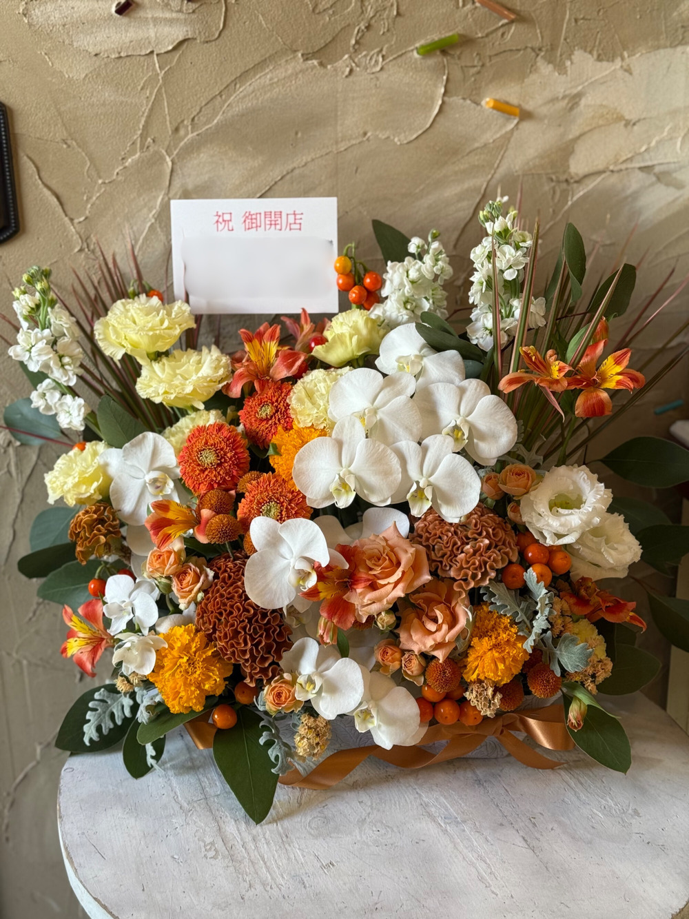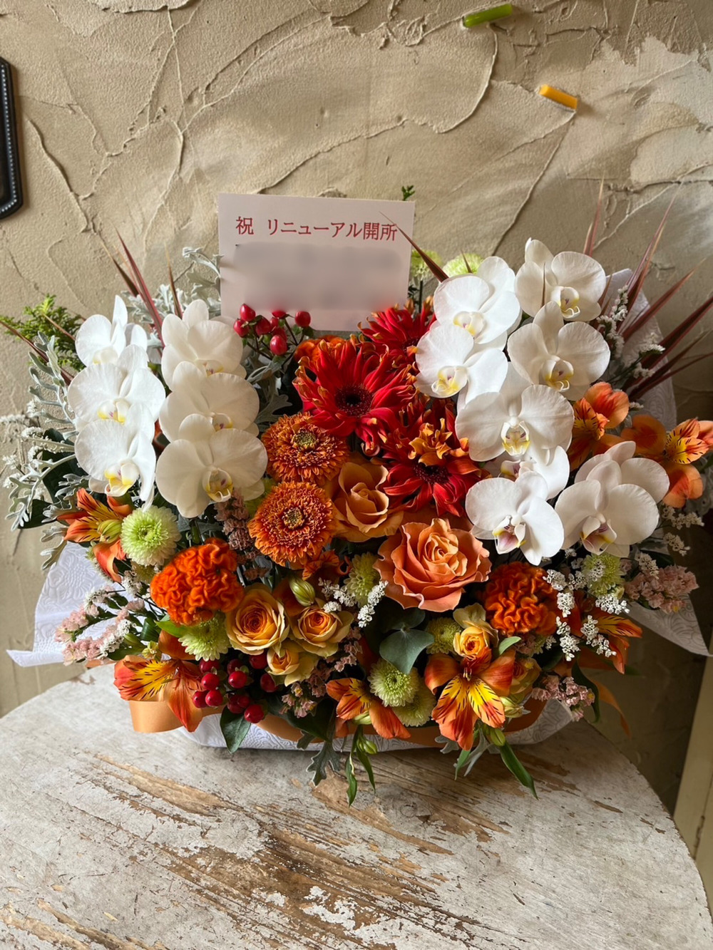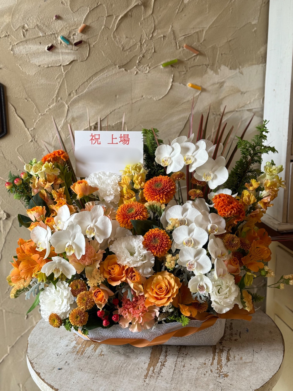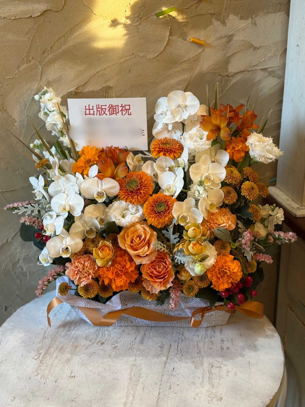 人気の胡蝶蘭を贅沢に3本お入れして、オレンジのガーベラやバラなどを合わせたアレンジ。お花に合わせて器をラッピングし、リボンをお付けしていますのでそのまま飾っていただける華やかなシリーズです。