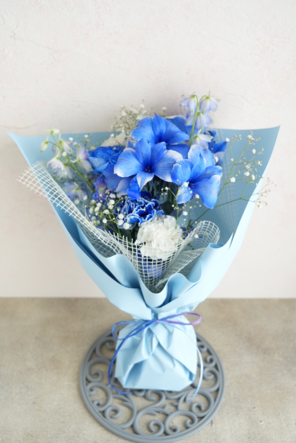 ブルーを基調とした花束は、澄み渡るような爽やかさと上品な落ち着きがが魅力です。