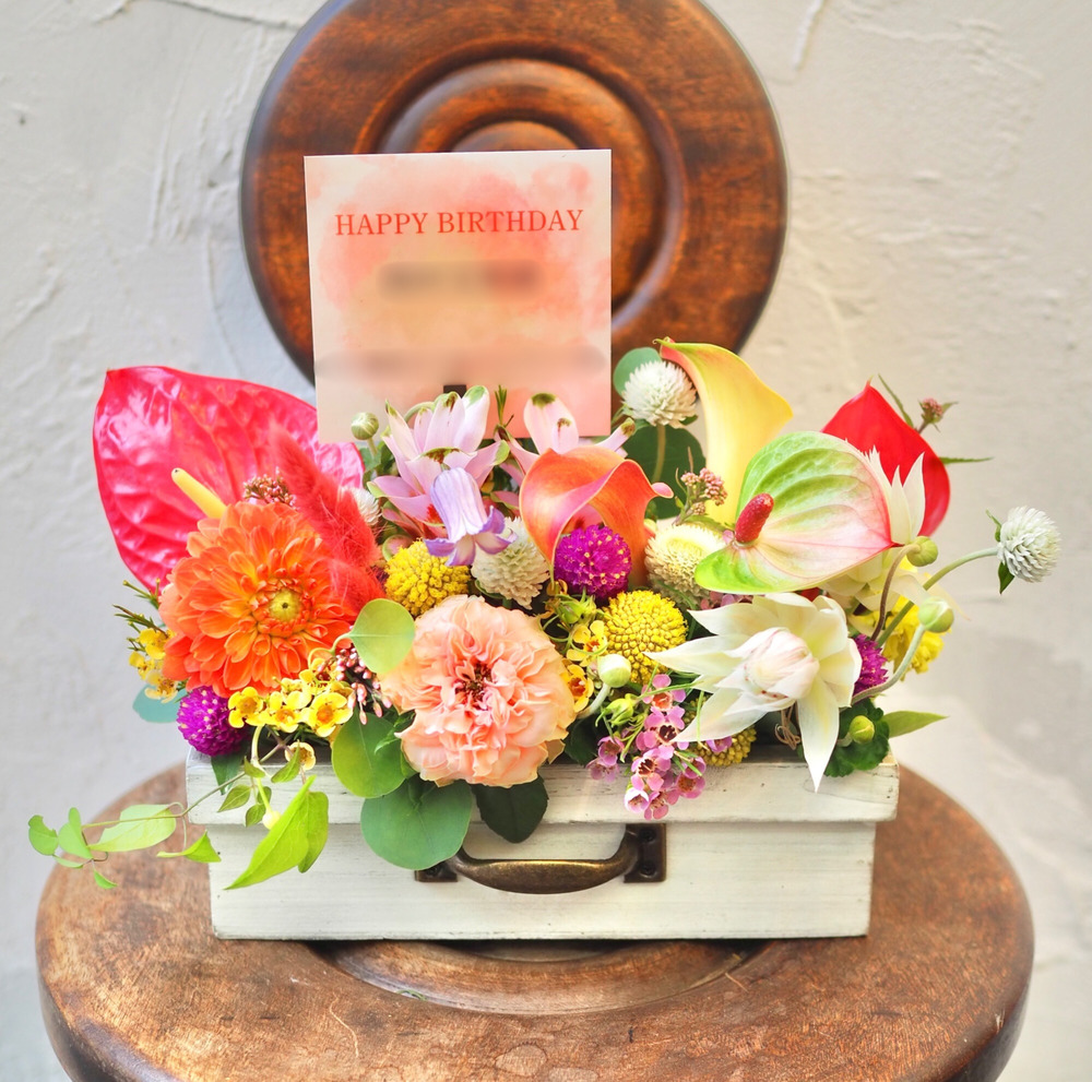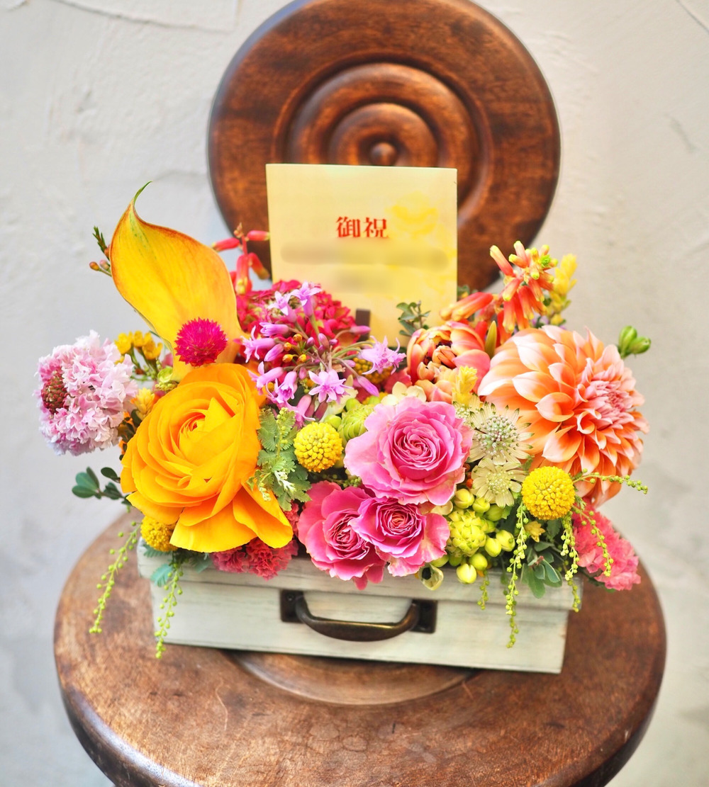 いろんな色味をミックスしてお作りする、フラワーデザイナー後藤亜希子におまかせの生花アレンジです。季節ごとの新鮮なお花をぎゅっと詰め込んで、ウッドトランクの中にナチュラルであたたかみのあるデザインで仕上げます。ちょっとした贈り物やご自宅用にもぴったり。温もりある木箱が、お花の魅力をいっそう引き立ててくれます。