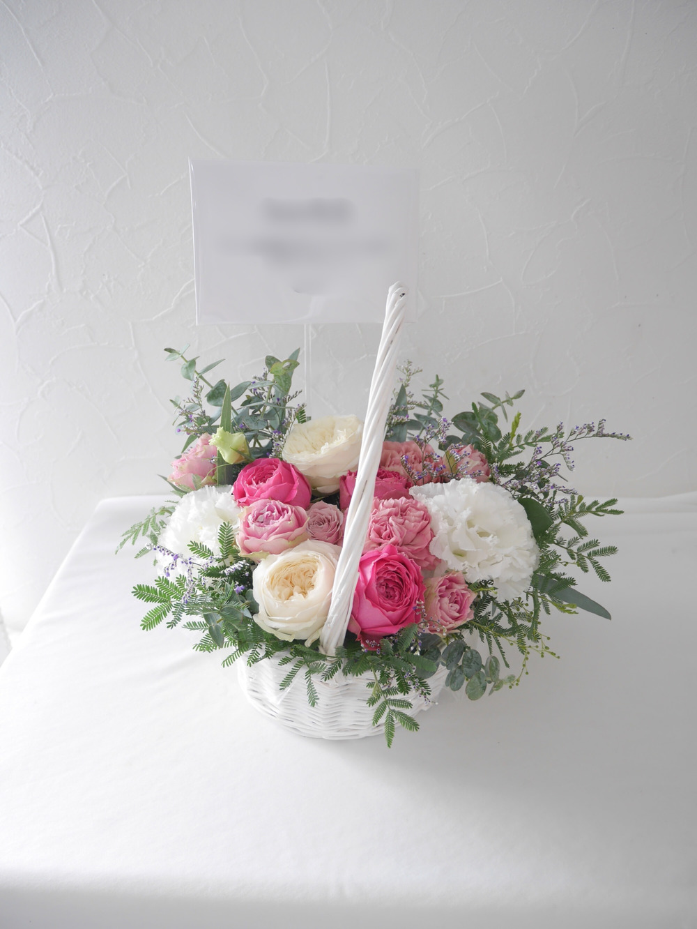 爽やかな白の取っ手付きのカゴにお花を敷き詰めたフラワーバスケットです。カゴいっぱいに摘んだお花入れたようなナチュラルなデザインに仕上げました。開店祝いや各種お祝いの贈り物としてもおすすめです。空間を明るく彩り、受け取る方へのお祝いの気持ちを、やさしく届けてくれます。