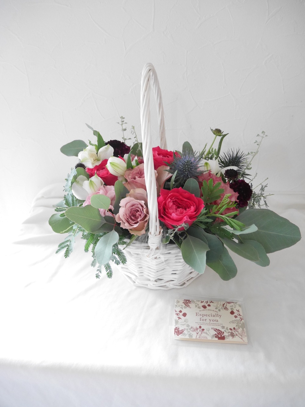 季節によって使用できるお花が異なるため、雰囲気が異なる場合があります。また、フラワーデザイナーが撮影した場所、角度によっても印象が異なることがあります。恐れ入りますが予めご了承ください。