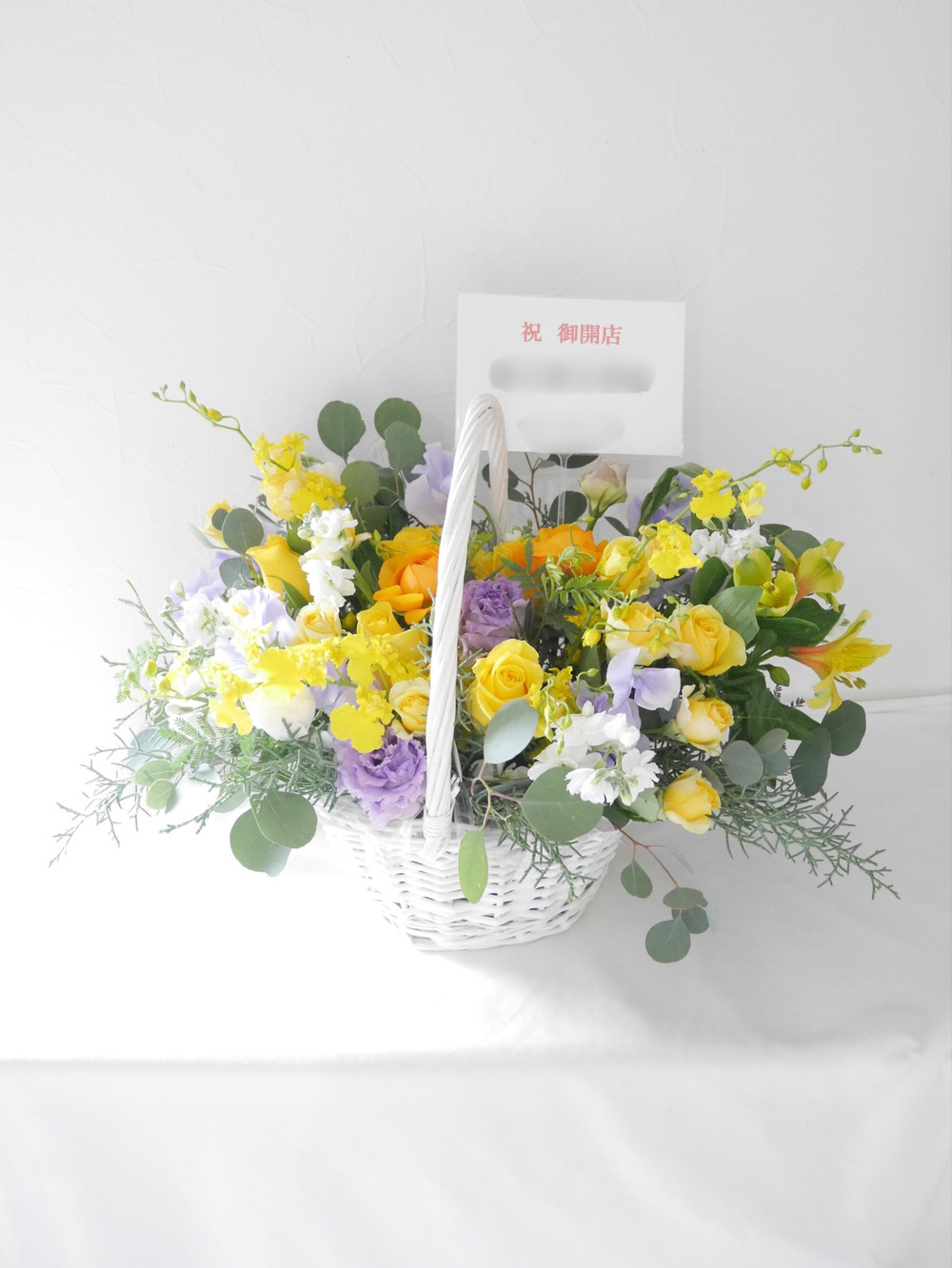 爽やかな白の取っ手付きのカゴにお花を敷き詰めたフラワーバスケットです。カゴいっぱいに摘んだお花入れたようなナチュラルなデザインに仕上げました。開店祝いや各種お祝いの贈り物としてもおすすめです。空間を明るく彩り、受け取る方へのお祝いの気持ちを、やさしく届けてくれます。