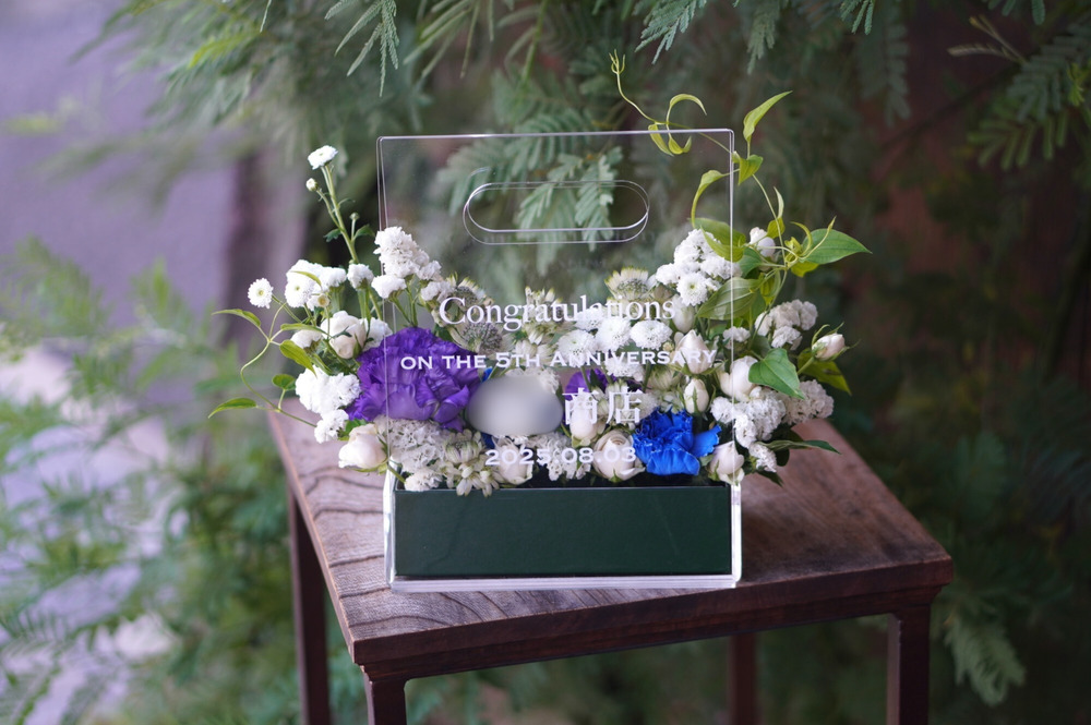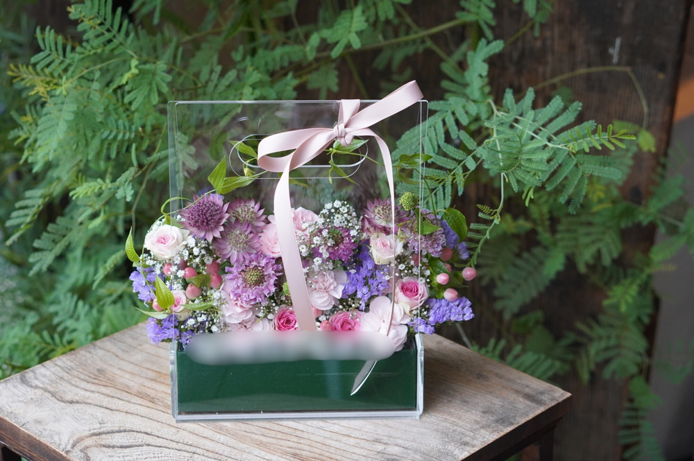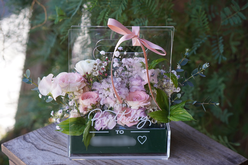 アクリル素材のクリアトートに、お好きな色味でお花をアレンジ。上品でスタイリッシュなデザインは、開店祝いや周年祝い、昇進祝いなど、さまざまなお祝いシーンにぴったりです。クリアトートには、店名やお名前、日付などの文字入れが可能。お花を楽しんだあとは、小物入れやディスプレイとしても活用できます。
