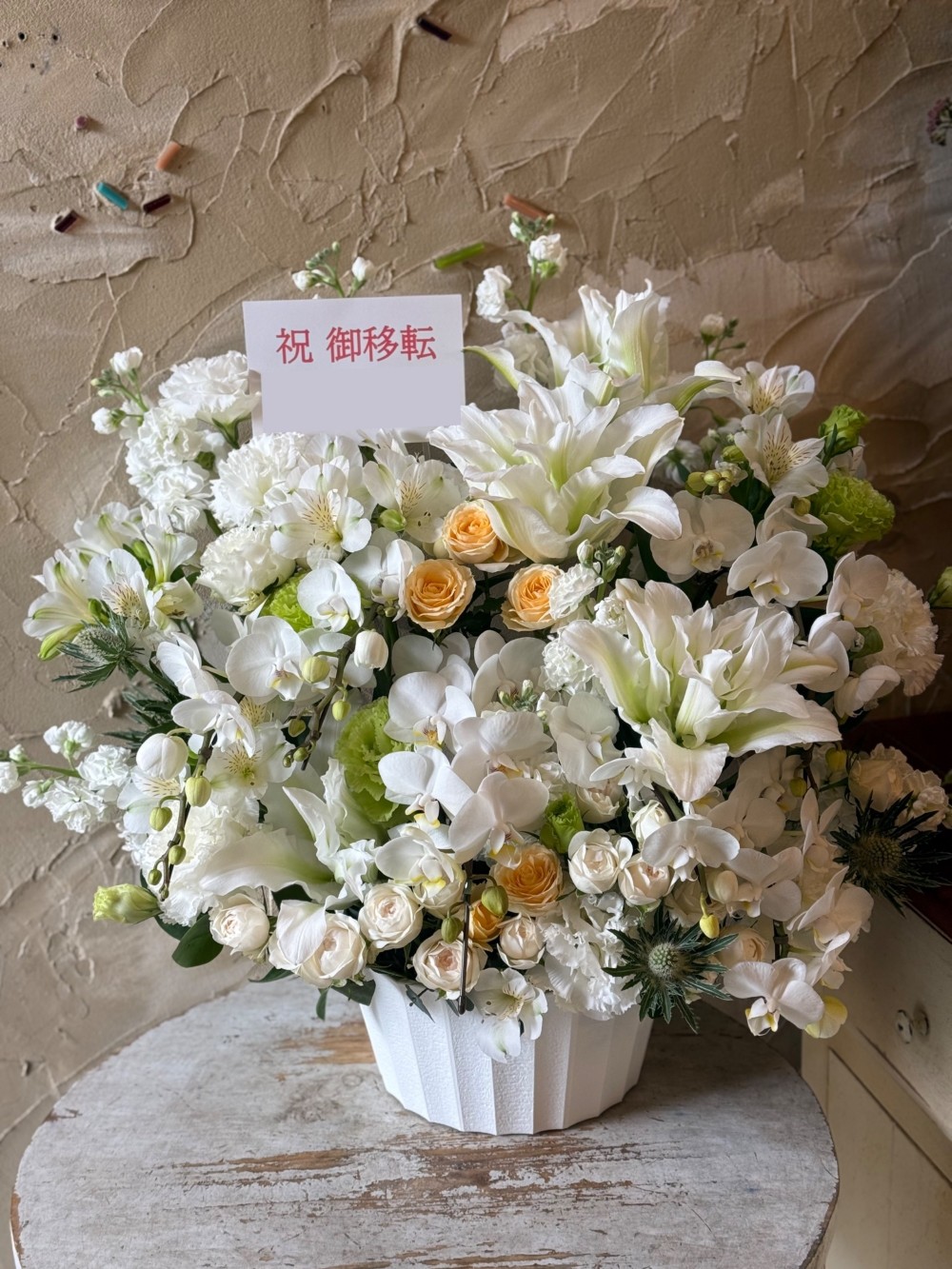人気の胡蝶蘭を贅沢に5本お入れして、八重咲の百合、白グリーンの花々をふんだんに使い、豪華にアレンジします。