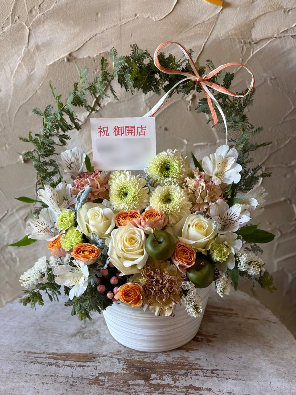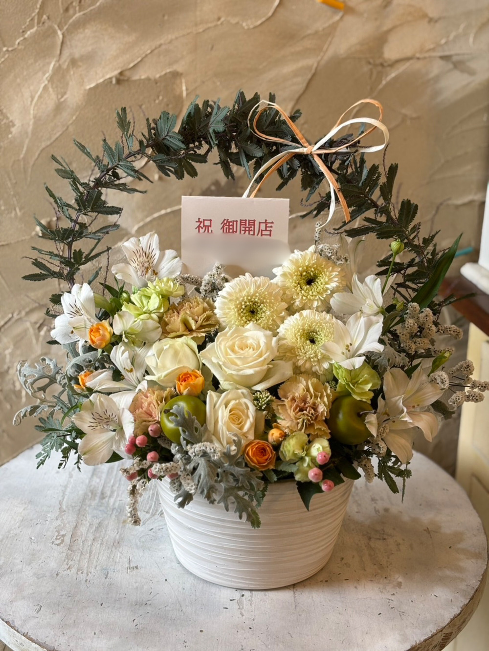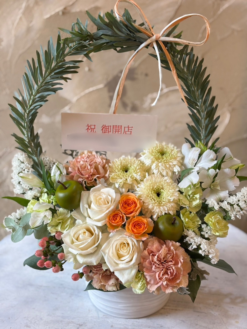白バラやガーベラ、オレンジのバラにベージュのカーネーションを合わせて大人っぽくナチュラルな雰囲気に仕上げました。これからのご活躍、商売繁盛、幸せな未来への架け橋になるように、そんな想いをアーチに込めてお作りいたします。