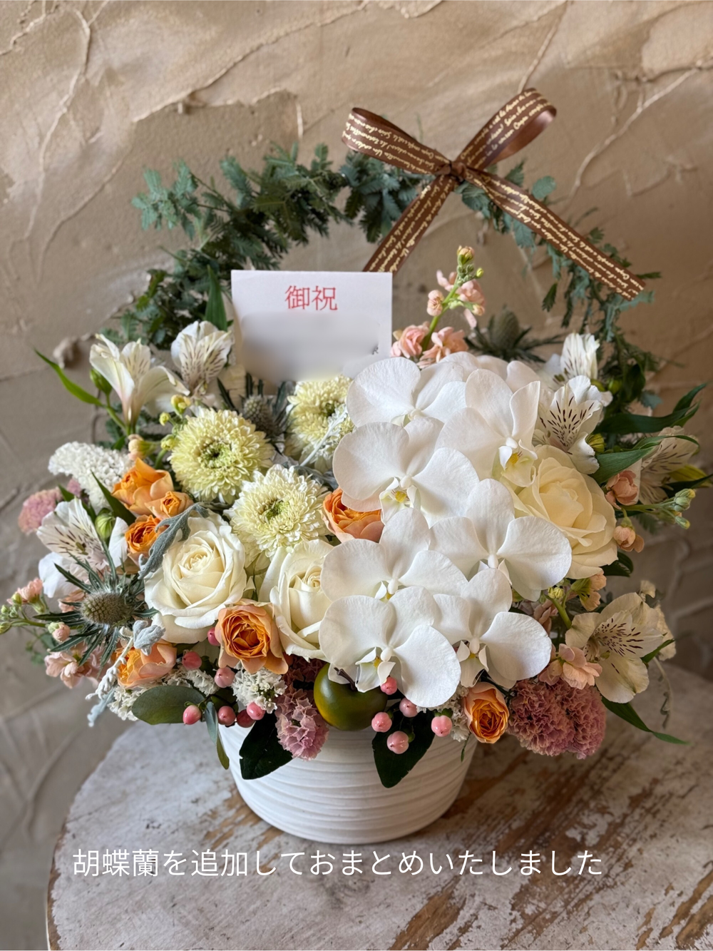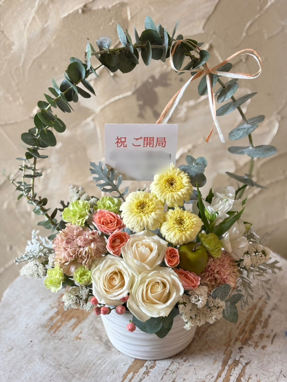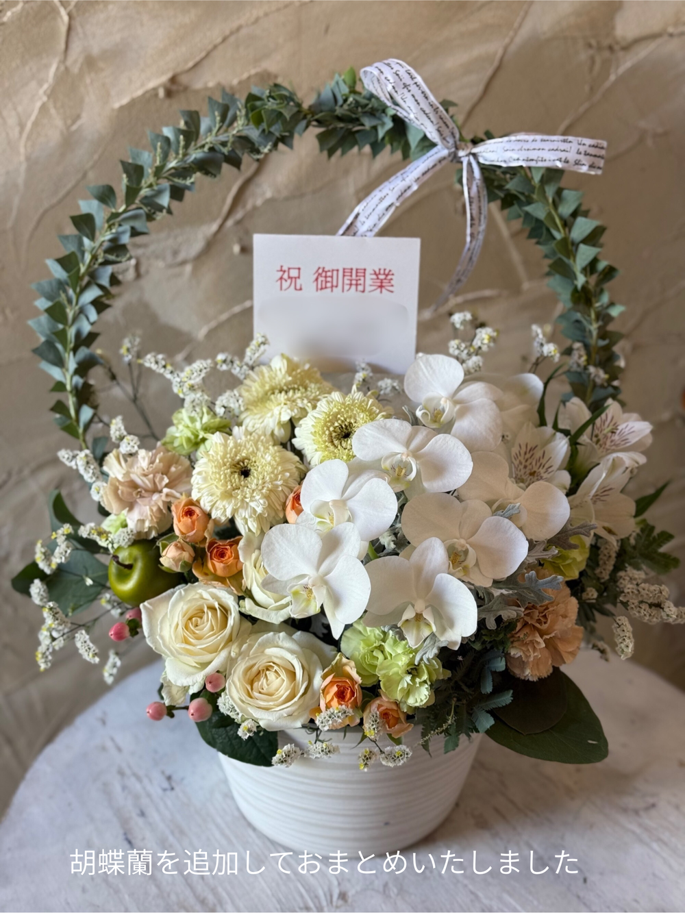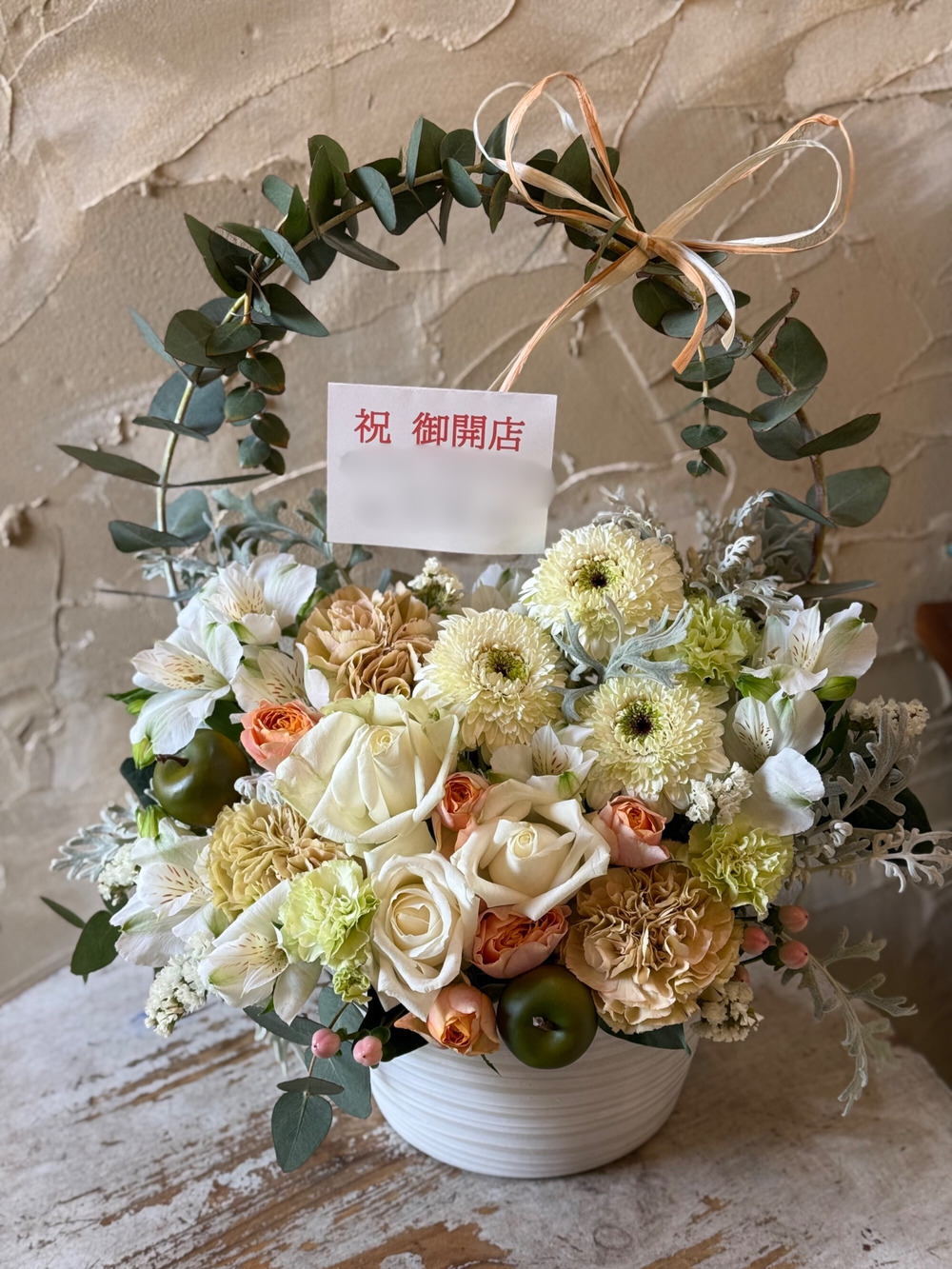 白バラやガーベラ、オレンジのバラにベージュのカーネーションを合わせて大人っぽくナチュラルな雰囲気に仕上げました。これからのご活躍、商売繁盛、幸せな未来への架け橋になるように、そんな想いをアーチに込めてお作りいたします。