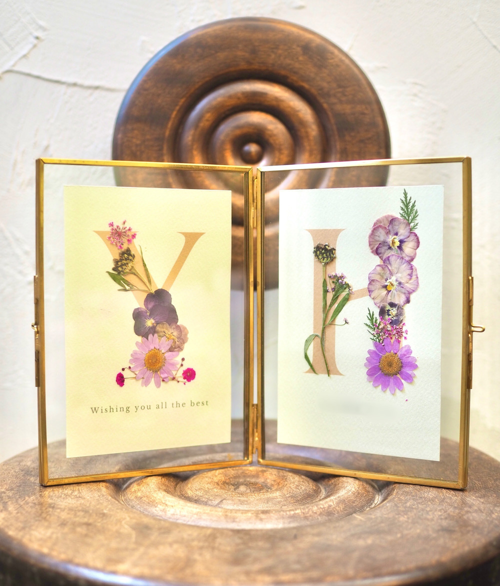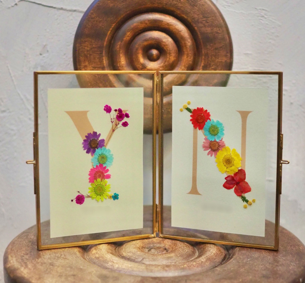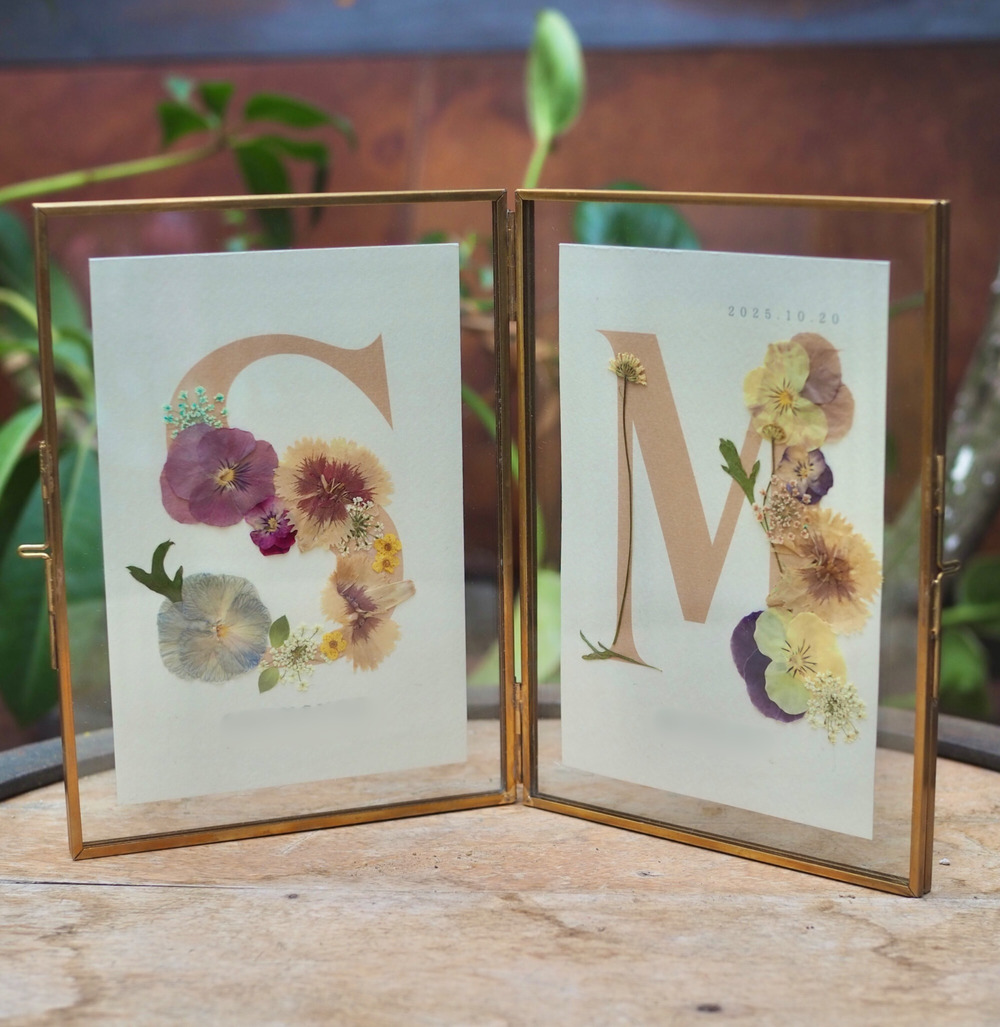 イニシャルに押し花をデコレーションした真鍮フレームのアレンジ。お花の色味はご希望の雰囲気でお作りいたします。イニシャル・イニシャル下の文字は自由にご指定いただけます。