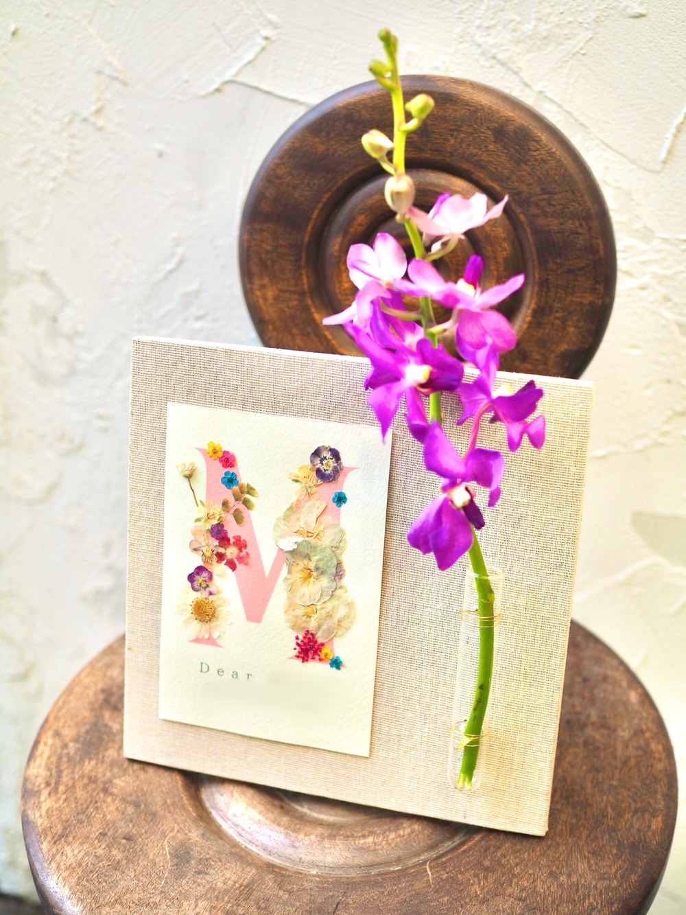 押し花をデコレーションしたイニシャルカードに、一輪のお花を添えて、お届けします。イニシャル・イニシャル下の文字は自由にご指定いただけます。押し花・一輪のお花はご希望の雰囲気でご用意いたします。一輪挿しは繰り返し使うことが可能なので、ずっと飾っていただけるフラワーギフトです。