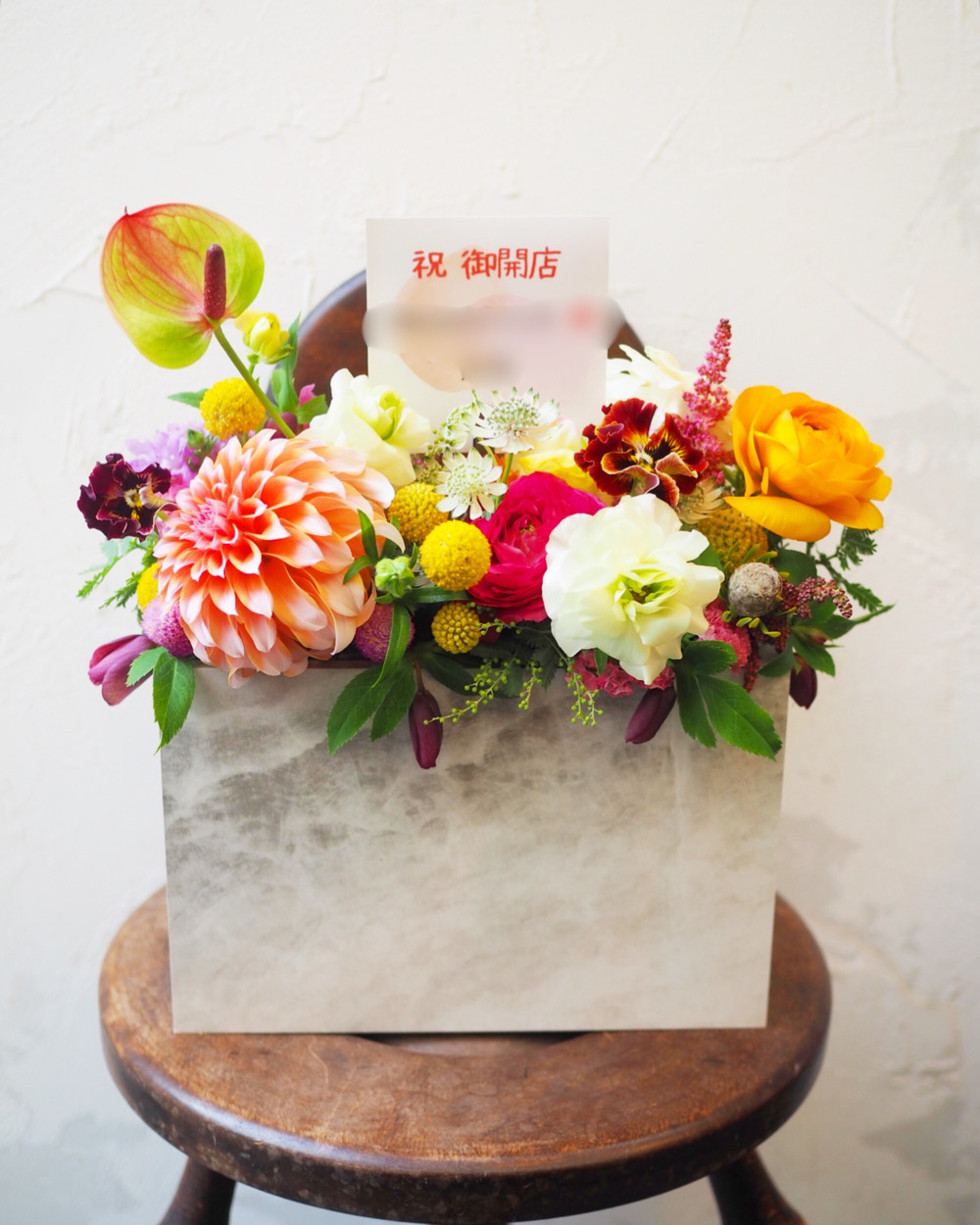 季節によって使用できるお花が異なるため、雰囲気が異なる場合があります。また、フラワーデザイナーが撮影した場所、角度によっても印象が異なることがあります。恐れ入りますが予めご了承ください。