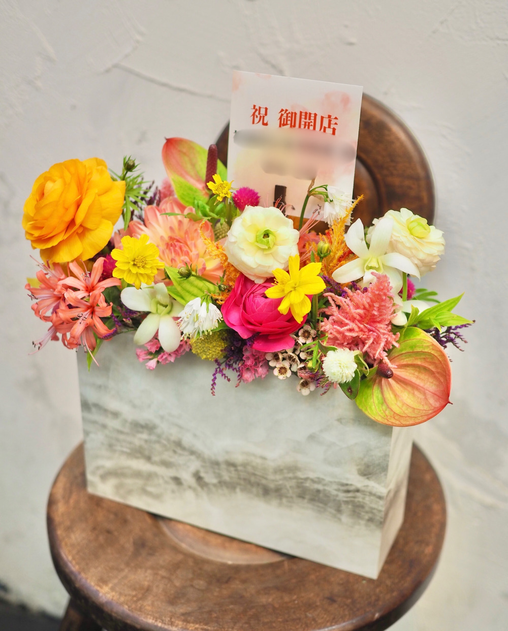 上品な大理石柄のベースに、フラワーデザイナー後藤亜希子がおまかせでお作りする季節の生花アレンジです。見た目は高級感のある大理石風ですが、素材は木製なのでとても軽く、気軽に飾っていただけるのが魅力。落ち着いた雰囲気と軽やかさを兼ね備えた、贈り物にもご自宅用にもおすすめのフラワーギフトです。お花は旬のものをふんだんに使い、花材の動きや表情をいかしたナチュラルで洗練されたデザインに仕上げます。蕾が開くことで少しずつ姿が変わり、日々の変化を楽しんでいただけます。