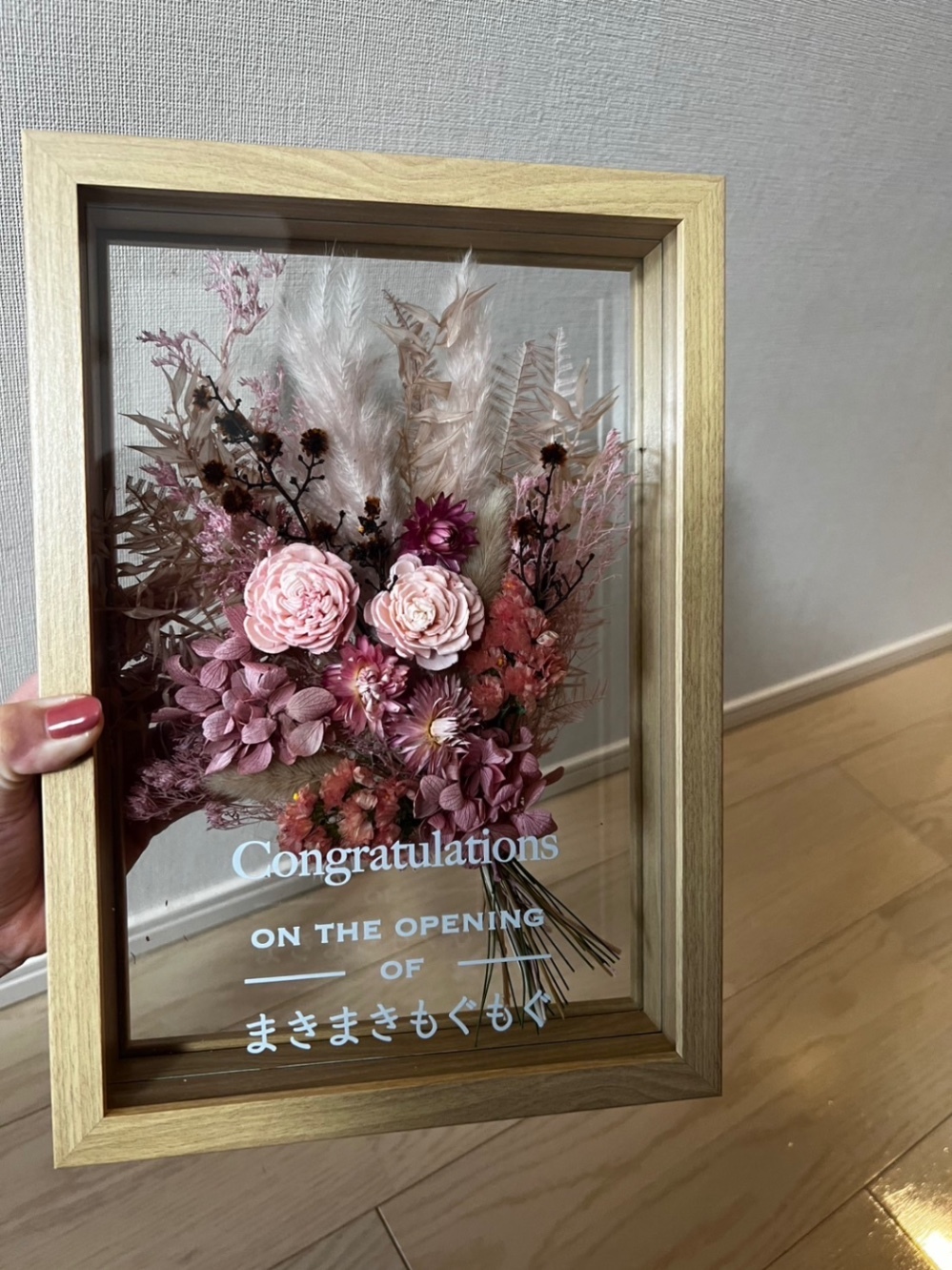 色等の希望を聞いて作製してもらえるところが有難いです。今回、小さいフレームだったのですが、思っていた以上にボリュームのある、華やかな花束で、大満足です。