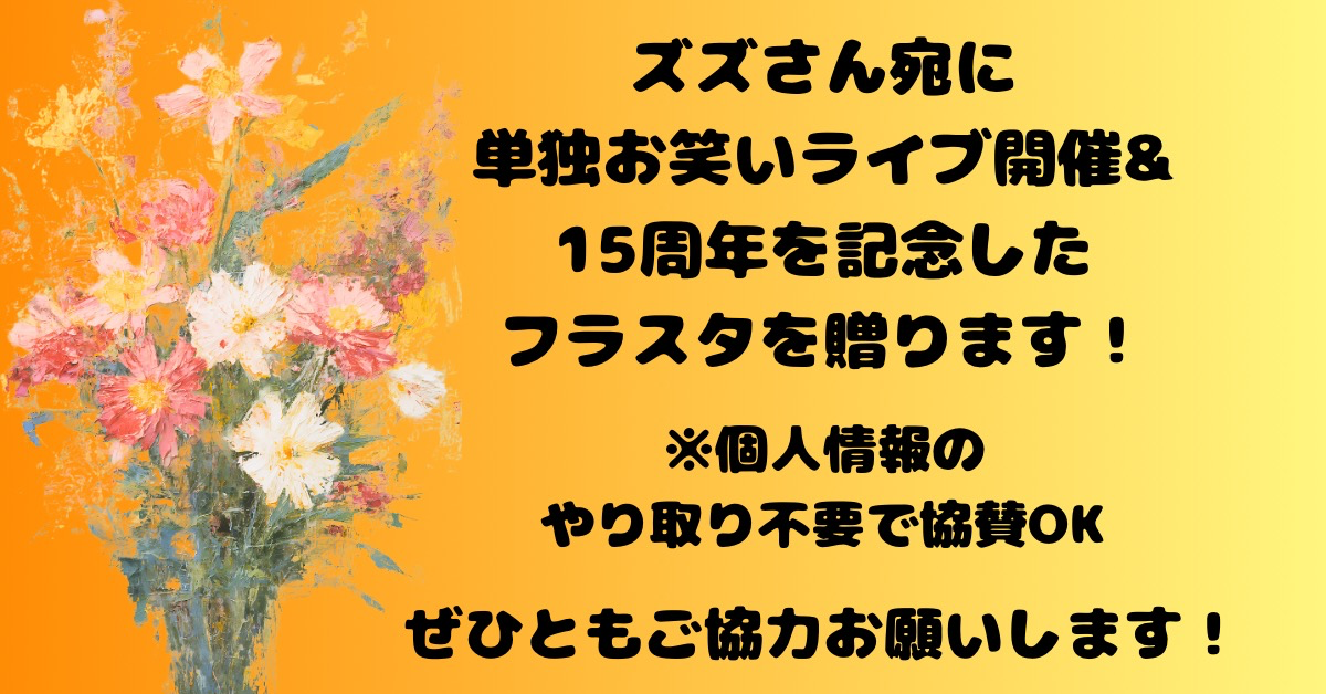 2026/2/8に開催されるズズさんの単独お笑いライブ【RANDOM】に、単独ライブ開催&活動15周年を記念して、リスナー一同よりフラワースタンドを贈ります!