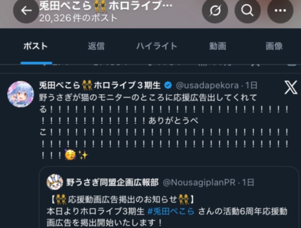 この度はみなさまにご出資いただきました、兎田ぺこらさん生誕を記念する応援広告の掲載が終了いたしました事、お知らせいたします。
