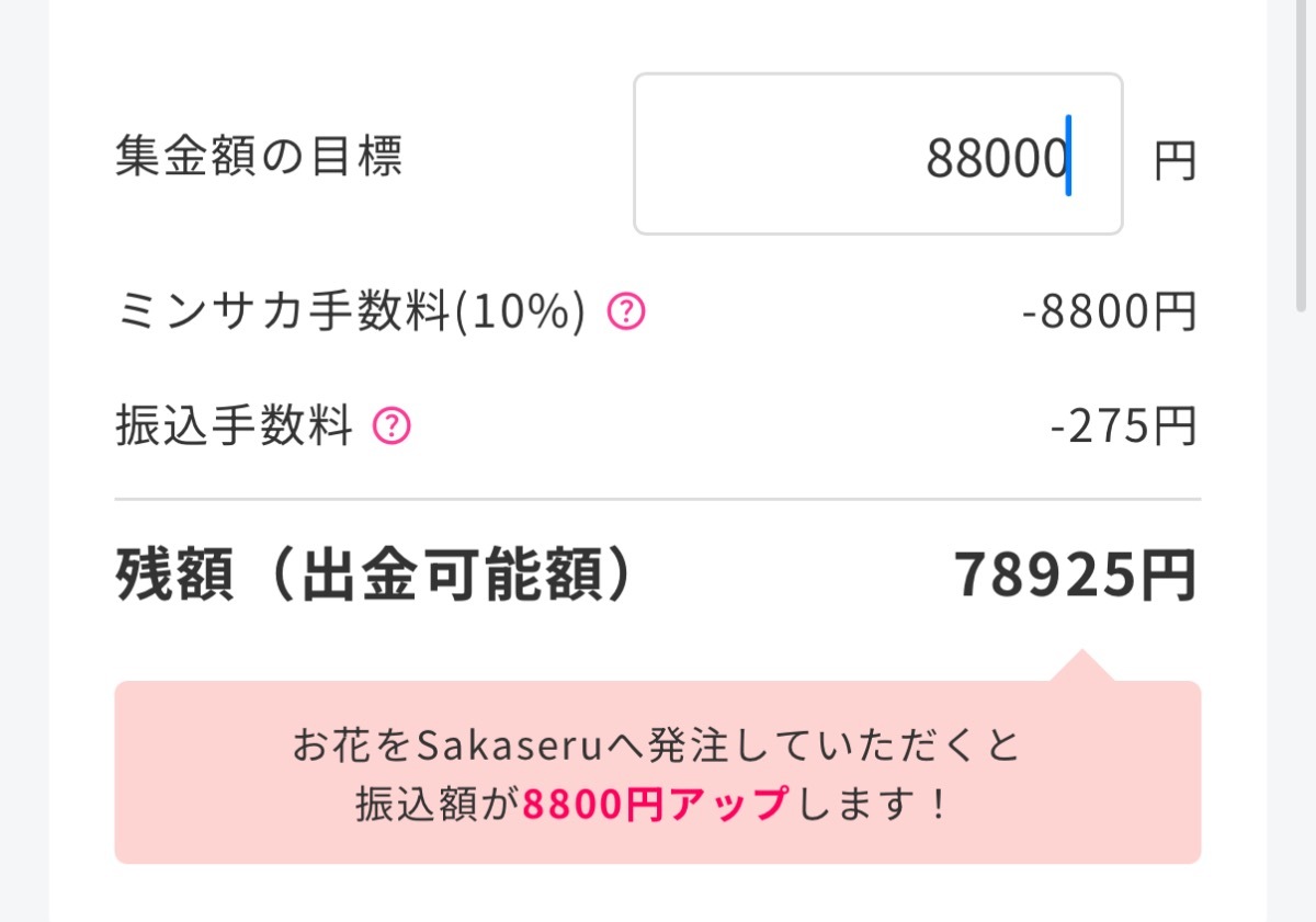 こちら88,000からミンサカへの手数料10%と振込手数料275円を差しいひて