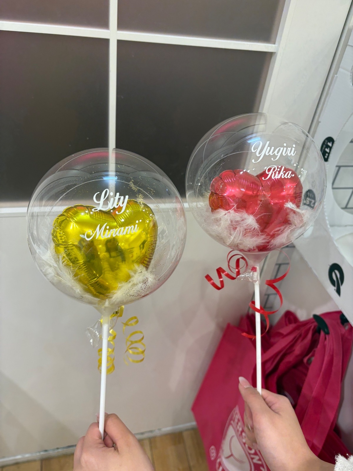 バルーンには、フランシュシュのキャラクター名と声優さんのお名前を並べて記載しております。中にはリベンジ衣装についてる羽のイメージで、羽を入れております。