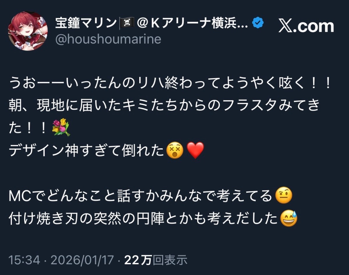 マリン船長のこのポストの通りフラスタをご覧になったそうです、きっと私たちのものも見てくれたことでしょう💐✨