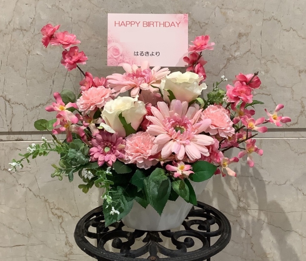 文字入れできる 気球バルーンとアートフラワーのアレンジ ピンク