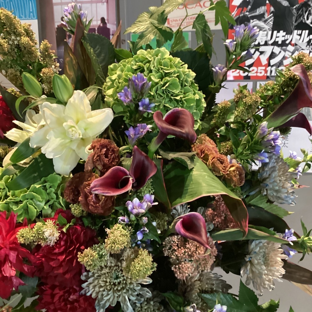 見ていただいた通り大人っぽいけれどダイナミックに飛びだっていくようなかっこいいフラスタにして頂きました。