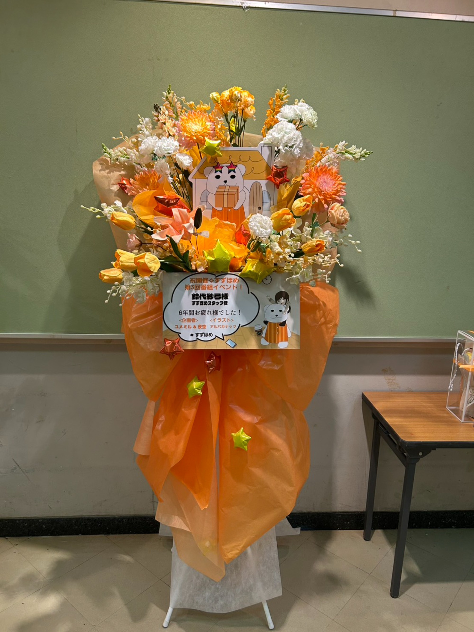 お花は、番組のテーマに合わせつつ出演している鈴代さんがオレンジ色が好きな方で今回そのイメージを元にご注文をさせていただきました。パネルのイラストは、番組で登場したキャラクターで、同じ番組のリスナーさんに書いて頂きました。