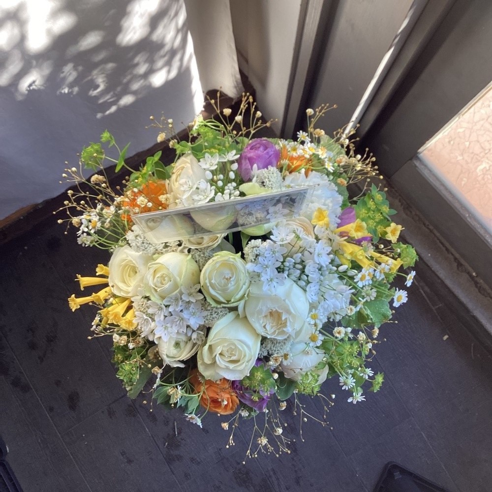 白い花々が演者本人で周りのカラフルな花がファン達というアレンジをお願いしました。